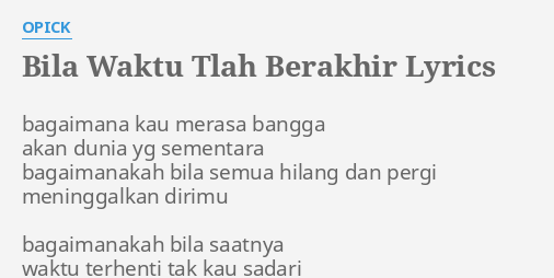 Lirik Lagu Opick Bila Waktu Telah Berakhir By Cici Aute - July 26 2014 Bagaimana kau merasa bangga Akan dunia yang sementara Bagaimanakah bila semua hilang dan pergi Meninggalkan dirimu Bagaimanakah bila saatnya. LIRIK LAGU BILA WAKTU TLAH BERAKHIR - OPICK by AHOK. Teman Sejati Tinggalah Sepi.